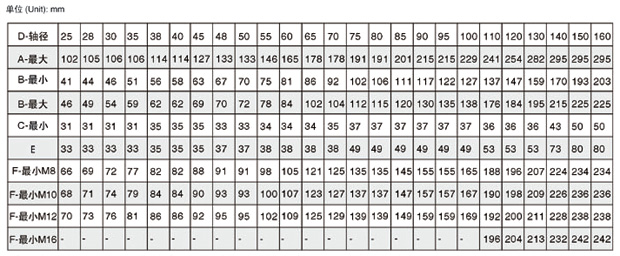 A-盖直径 B-填料腔内径直 C-轴或轴套直径 E-填料腔外侧密封长度 F-相应于不同螺栓规格的最小螺栓中心距